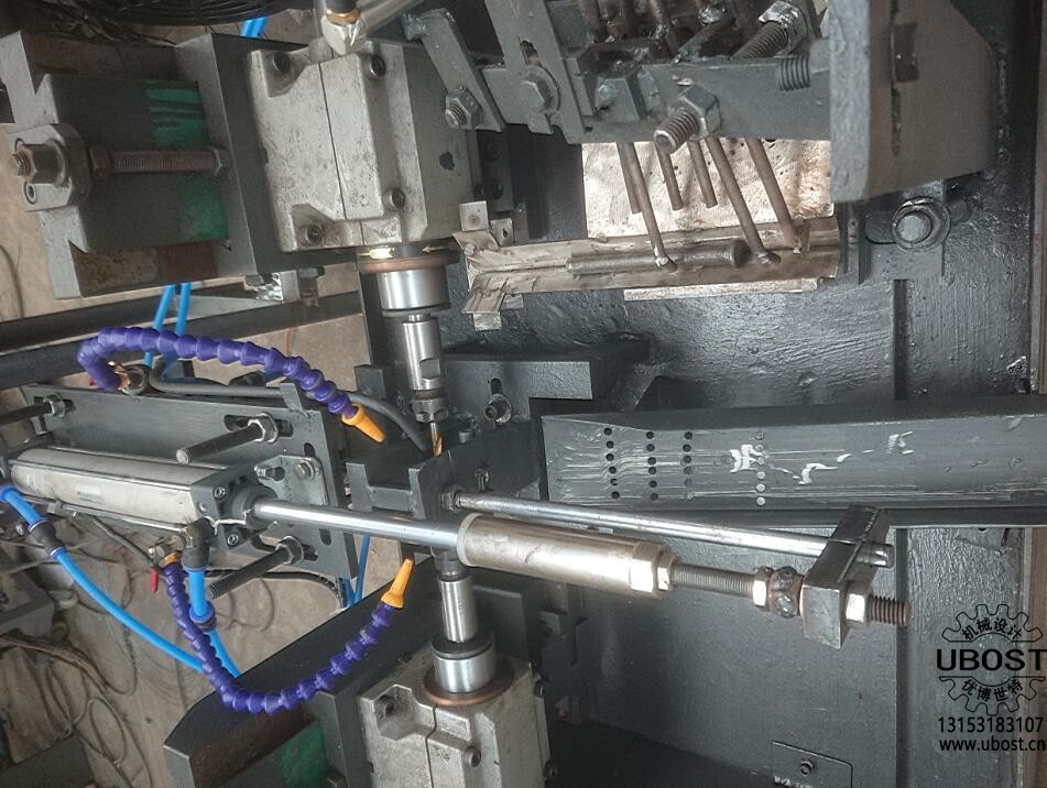 該機(jī)采用鉆模具鉆孔,通過料斗自動送料到滑道中,再用氣缸推動工件進(jìn)入鉆模中,數(shù)控系統(tǒng)自動控制二臺鉆孔氣動動力頭進(jìn)給倒角、鉆孔;鉆孔速度及深度可由油壓緩沖器調(diào)整,自動落料。