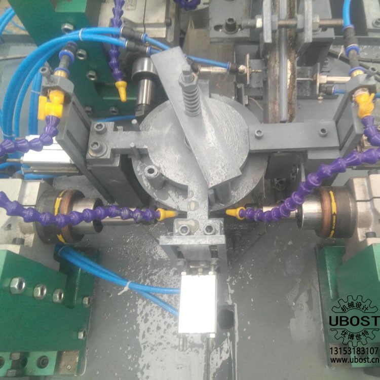 自動送料,自動夾緊、自動轉(zhuǎn)位、自動倒角、自動鉆孔、自動退料。每個動作由分度盤在不同工位同時完成,實現(xiàn)鉆孔、倒角。